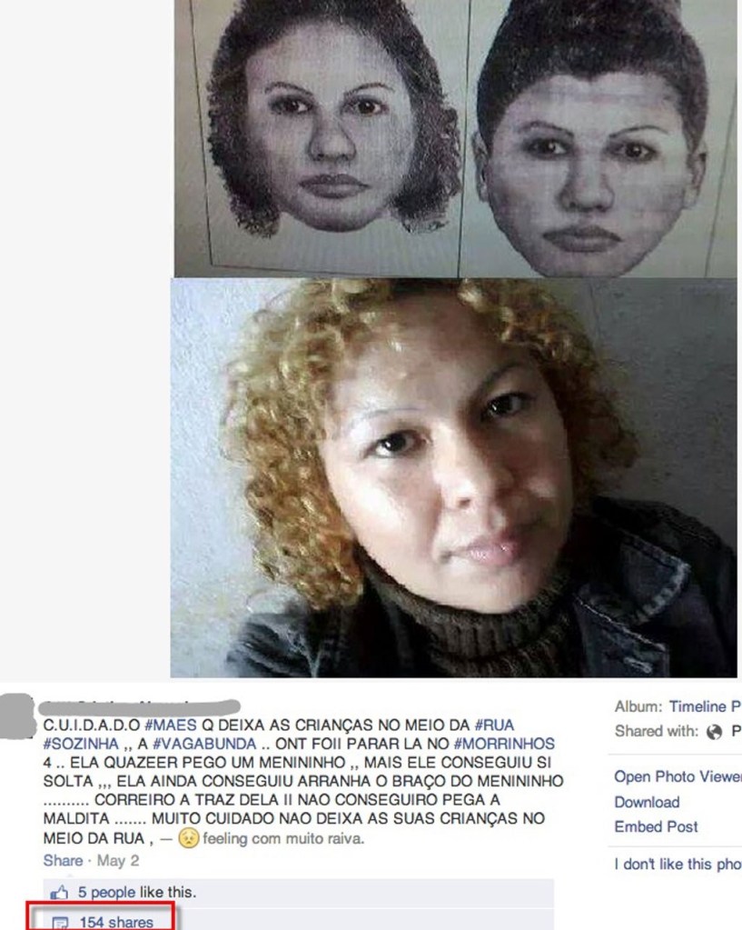 Em 2014, na periferia do Guarujá, São Paulo, outro caso de Fake News chocou o Brasil e levou Fabiane Maria de Jesus a morte.