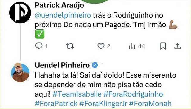 Em um post, o cantor Patrick Araújo sugeriu que o pagodeiro Uendel Pinheiro trouxesse Rodriguinho como atração para seus shows em Manaus, em resposta, Uendel disparou: